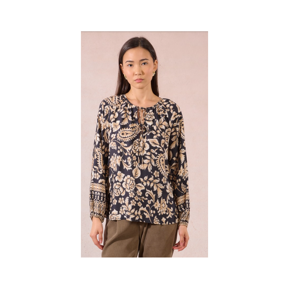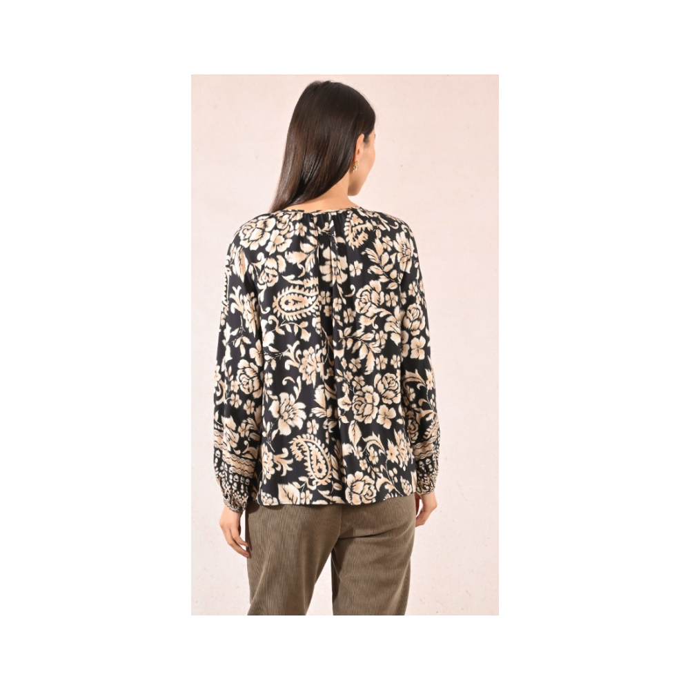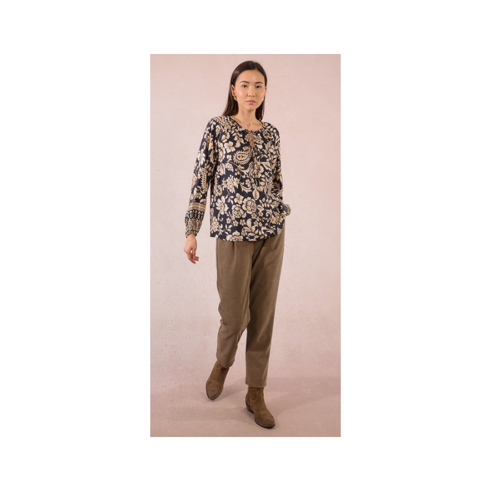 -Encolure ronde, réhaussée par un décolleté en V avec liens à nouer