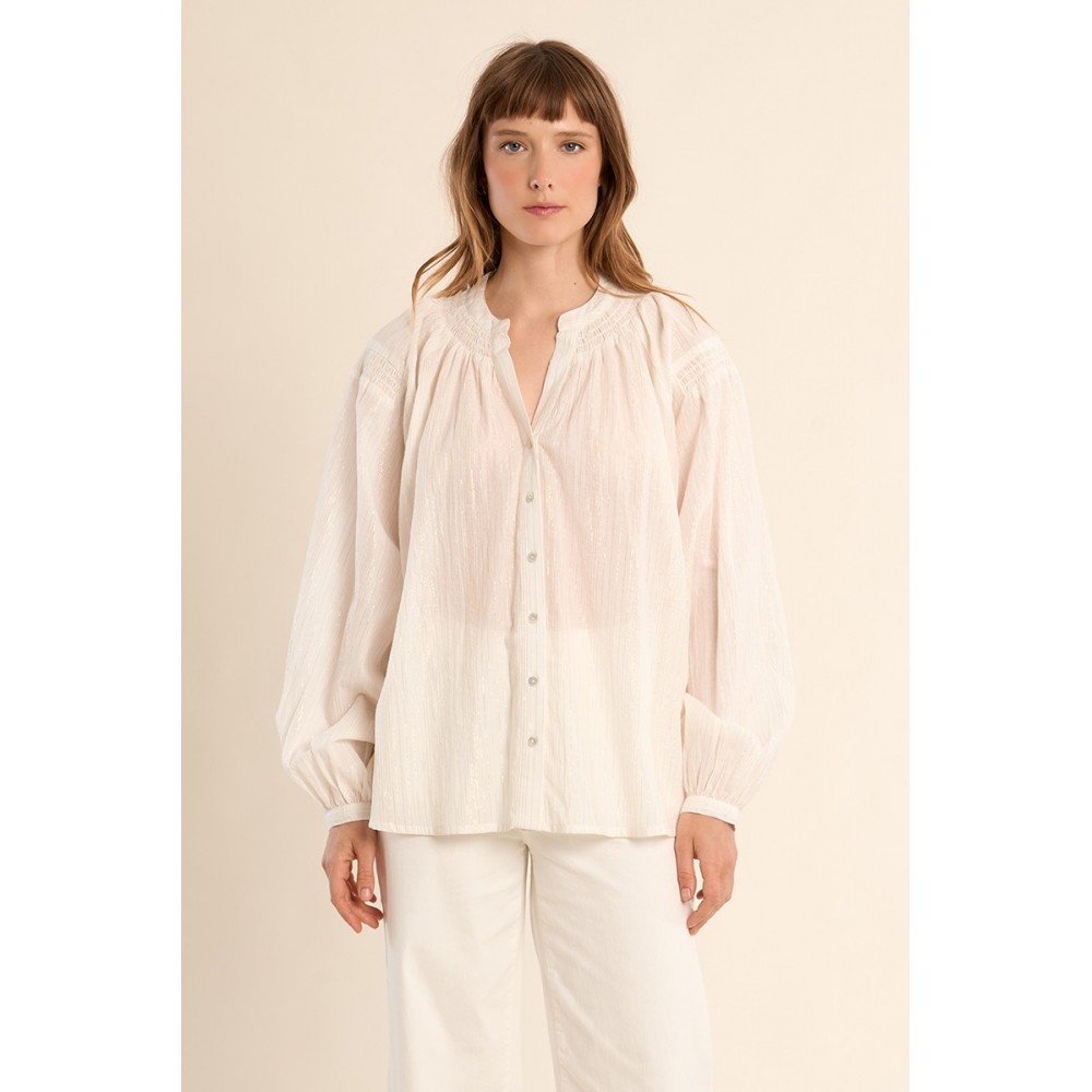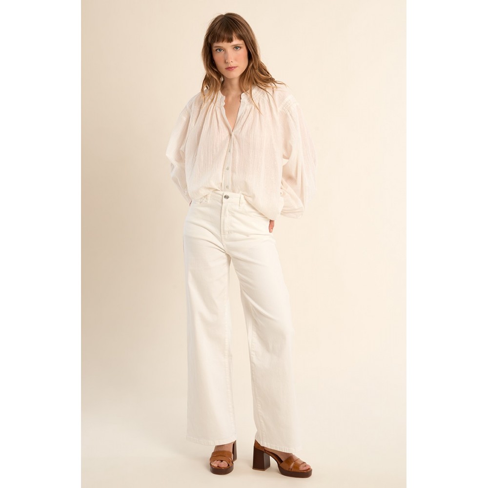 Blouse en coton, col mao -Manches longues, boutonnées sur les poignets -Col mao souligné de volants -Coupe large -Longueur depuis l'épaule 67cm pour une taille S"