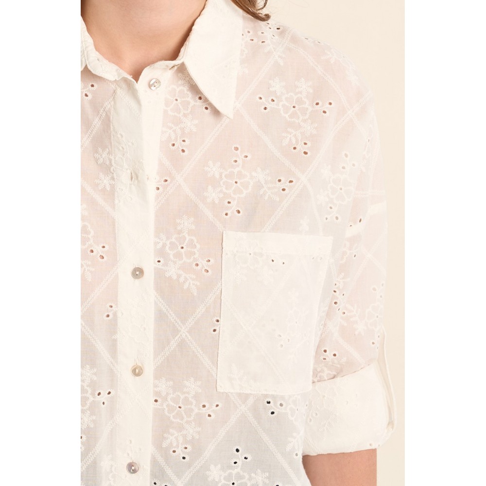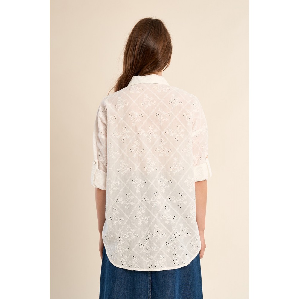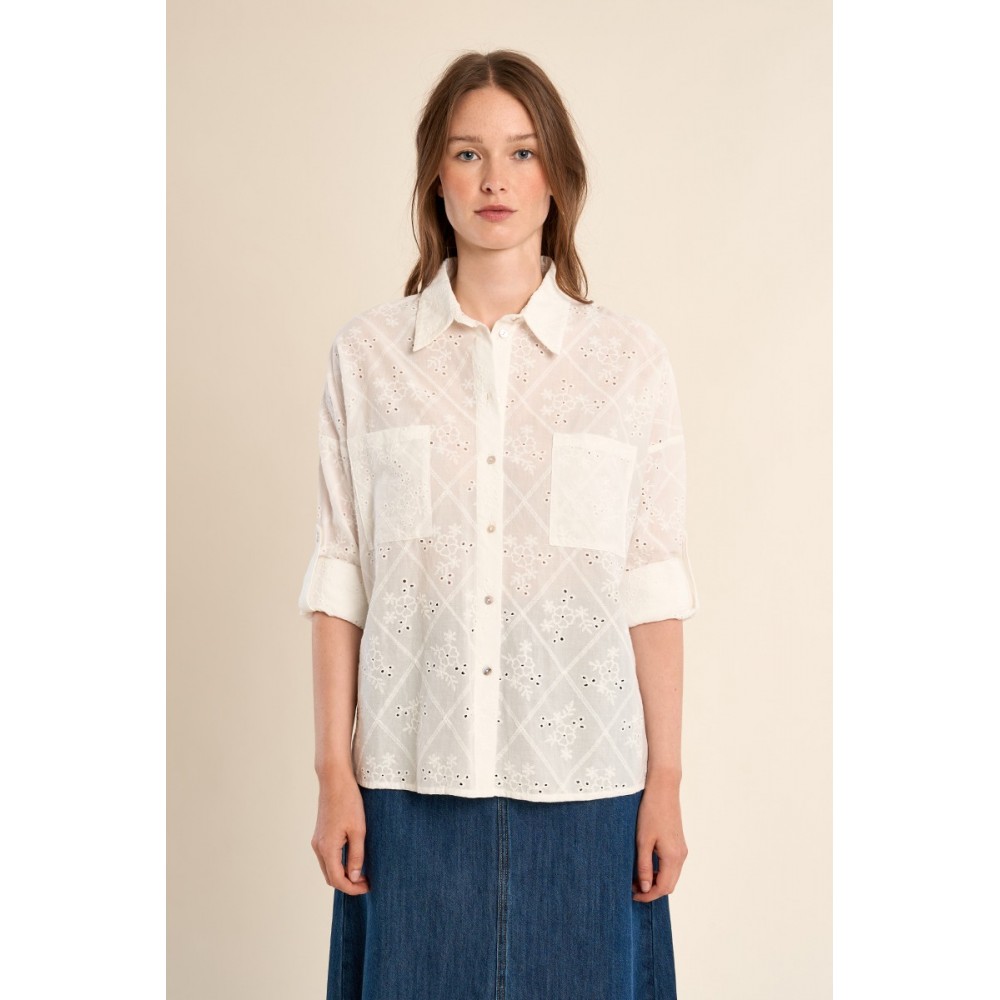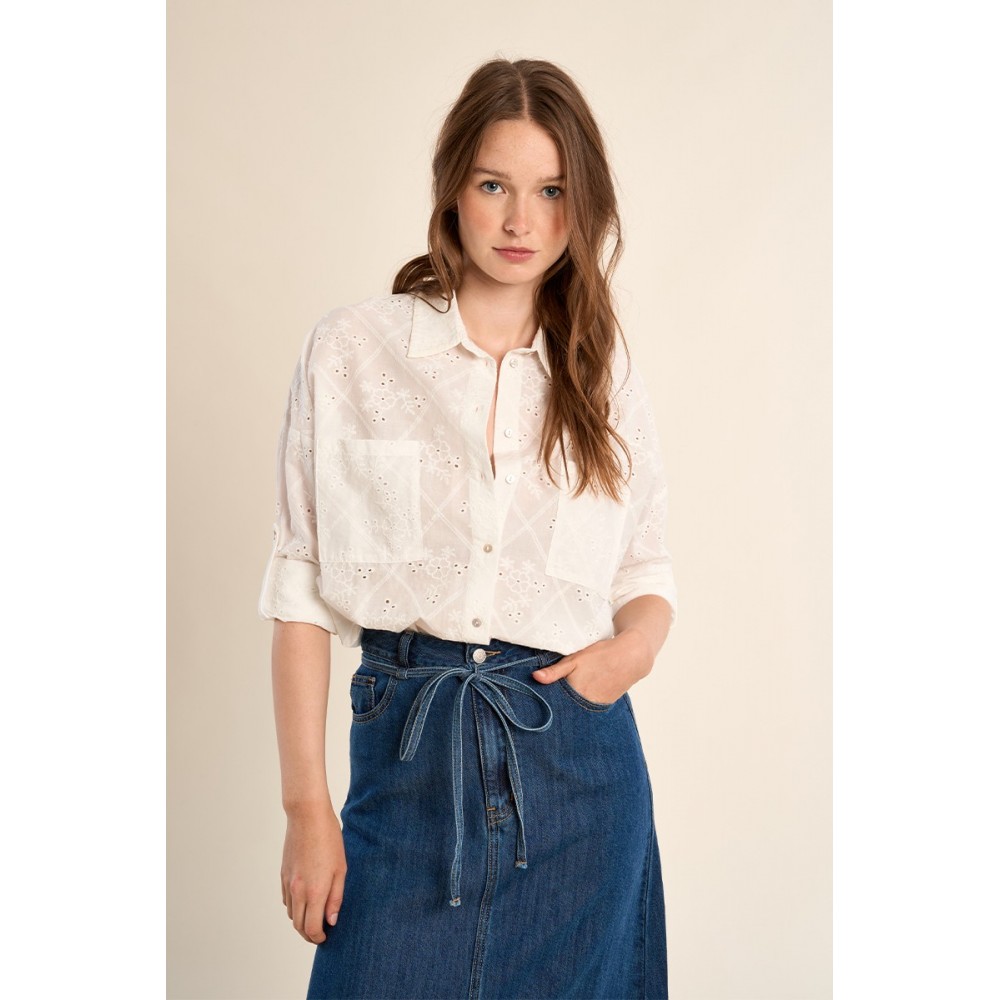 Chemise en coton, broderie anglaise -Manches longues, poignets boutonnés -Col chemisier -Coupe oversize -Fermeture par boutons sur toute la longueur devant -Longueur depuis l'épaule 66cm pour une taille S