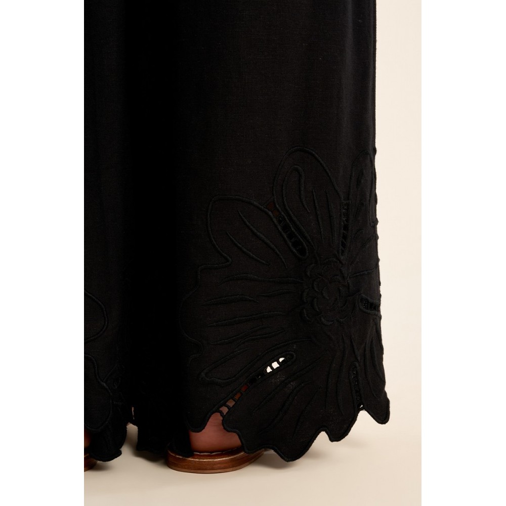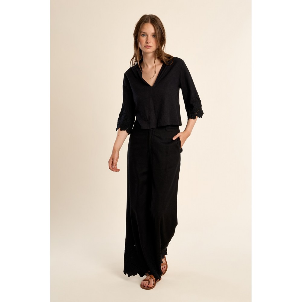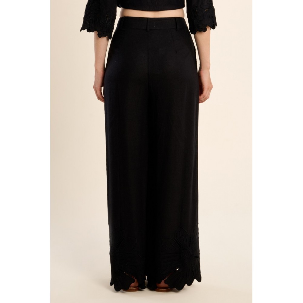 Pantalon droit, en coton -Taille haute, fermeture par bouton et zip -Poches plaquées -Finition bas en broderie ajourée -Longueur depuis le côté 105cm pour une taille S"