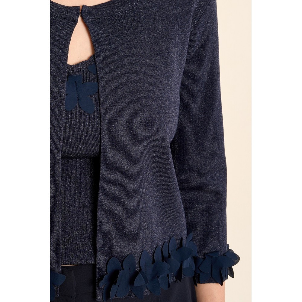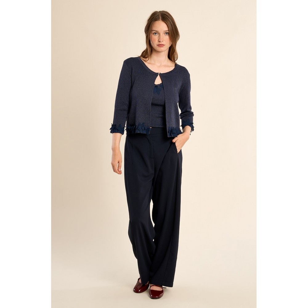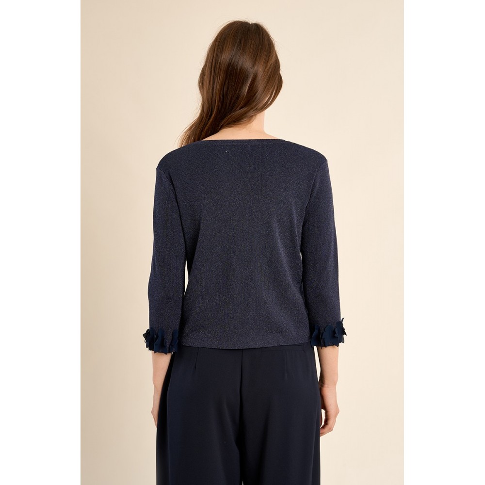 Cardigan court en maille irisée -Manches 3/4 finitions fantaisie -Encolure ronde -Fermeture par un bouton sous l'encolure -Coupe droite -Fleurs fantaisie -Longueur depuis l'épaule 52cm pour une taille S