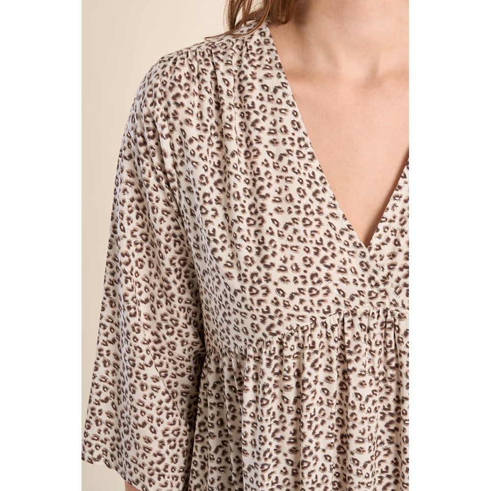 Robe courte imprimée léopard -Encolure V -Manches mi-longues -Coupe légèrement évasée, multi-volants -Longueur depuis l'épaule 90cm pour une taille S"