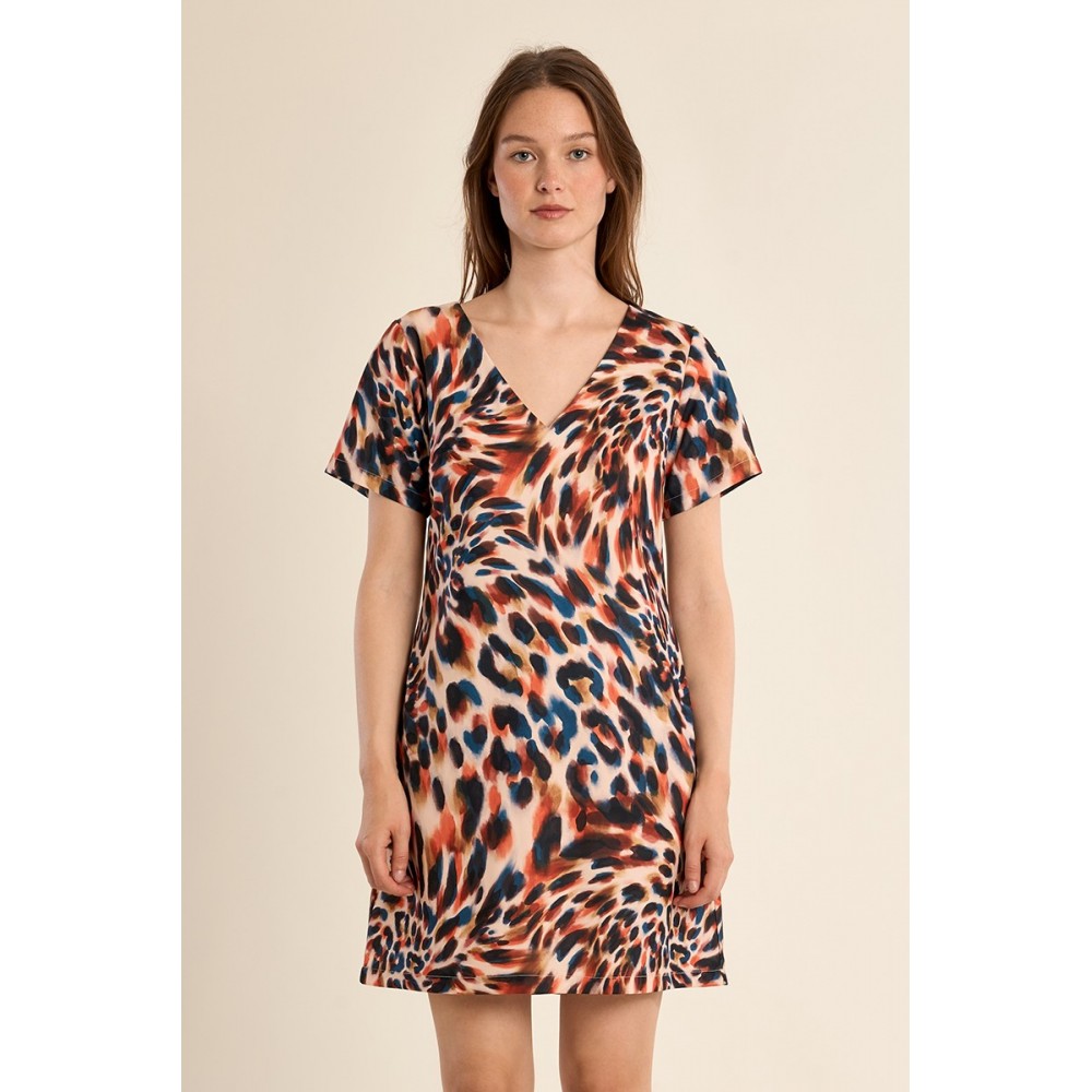 -Robe courte et droite, imprimée -Manches courtes -Encolure V -Pinces sur la taille -Longueur depuis l'épaule 88cm pour une taille S"